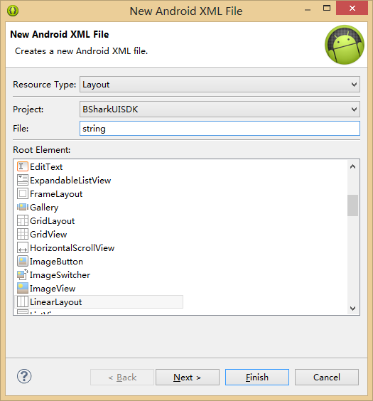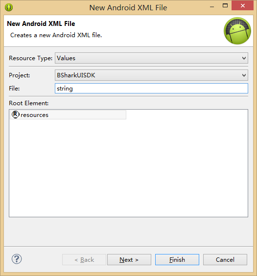 首先我们点击添加Android Xml File按钮,在Resource Type中选择Values 在File中输入string.xml ,会出现下面的界面: