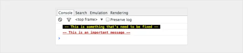 在 console.log() 中, 可以用 %s 设置字符串,%i 设置数字,%c 设置自定义样式等等,还有很多更好的 console.log() 使用方法。 如果使用的是单页应用框架,可以为视图(view)消息创建一个样式,为模型(models),集合(collections),控制器(controllers)等创建另一个样式。也许还可以像 wlog,clog 和 mlog 一样发挥想象力!