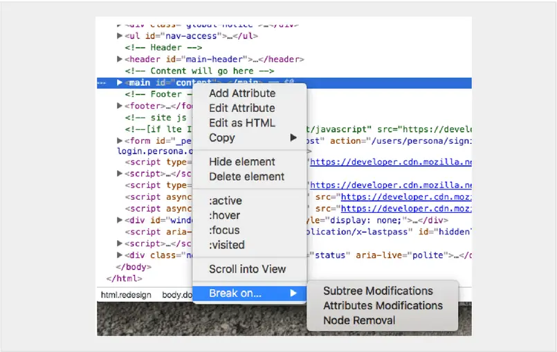 DOM 是一个有趣的东西。 有时候它会被修改,但是你并不知道为什么。 但是,当您需要调试 JavaScript 时,Chrome会让您在DOM元素发生更改时暂停。 你甚至可以监视它的属性。 在Chrome 检查器中,右键单击该元素,然后在设置中选择一个中断就可以了: