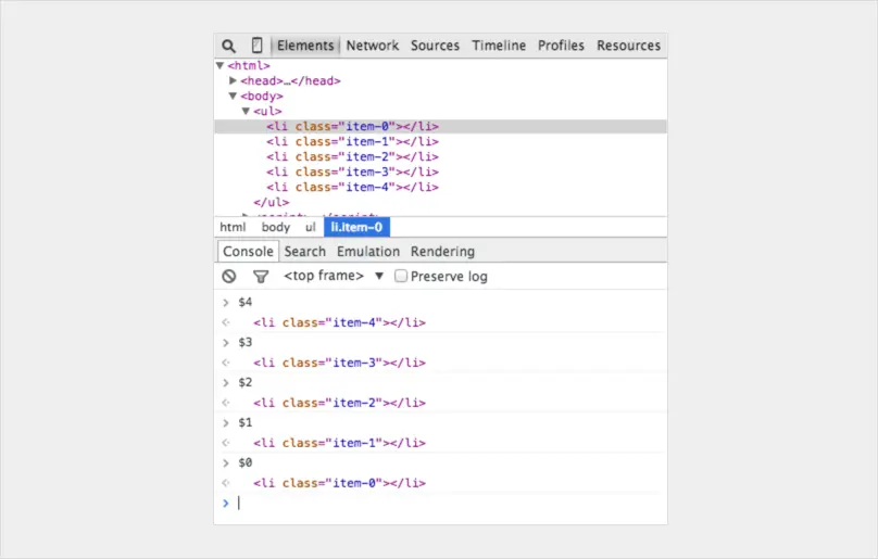 如果你按照“item-4”,“item-3”,“item-2”,“item-1”,“item-0”的顺序标记下列项,则可以在控制台中像这样访问DOM节点: