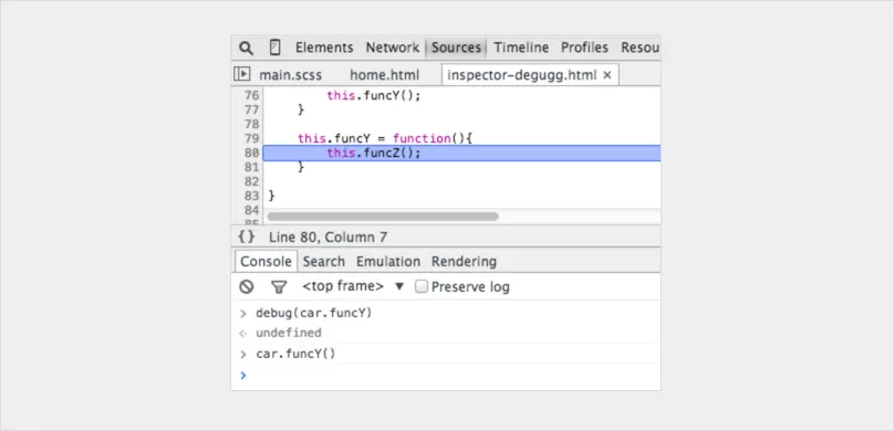 在控制台中输入 debug(car.funcY) ,当调用 car.funcY 时,脚本将以调试模式停止:
