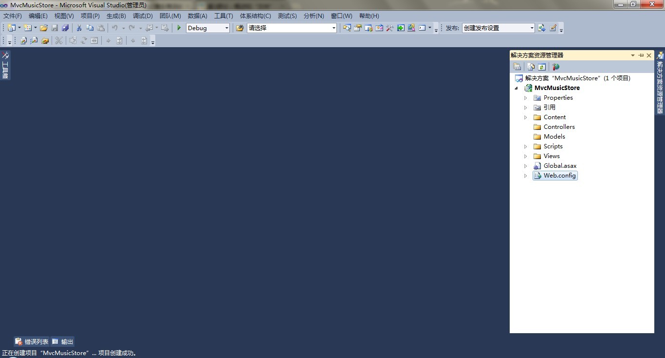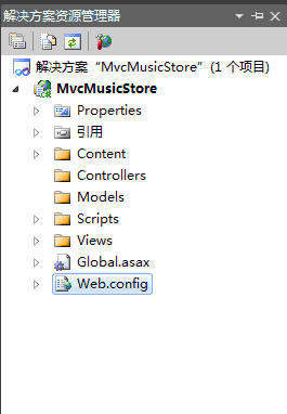 在右侧的“解决方案资源管理器”中,我们可以看到新建的Mvc音乐商店项目