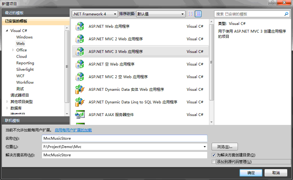 在左侧选择Visual C# - > Web模板组,然后选择“ASP.NET MVC 3 Web 应用程序”,将解决方案名称命名为“MvcMusicStore”,然后按“确定”按钮