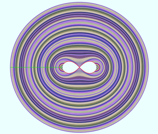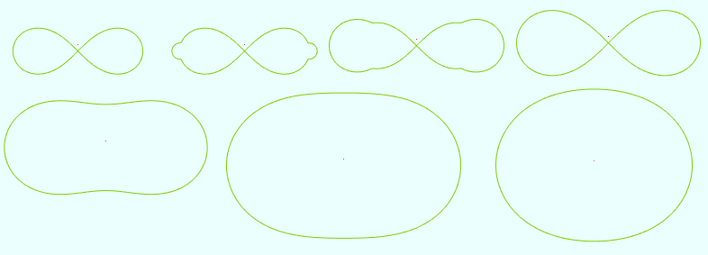 #http://www.mathcurve.com/courbes2d/cassini/cassini.shtml vertices = 1000 t = from (-PI) to (PI) a = 10 b = rand2(0, 4*a) e = b/a; p = a*sqrt(cos(2*t) + sqrt(e^4 - sin(2*t)^2)) x = p*cos(t) y = p*sin(t)