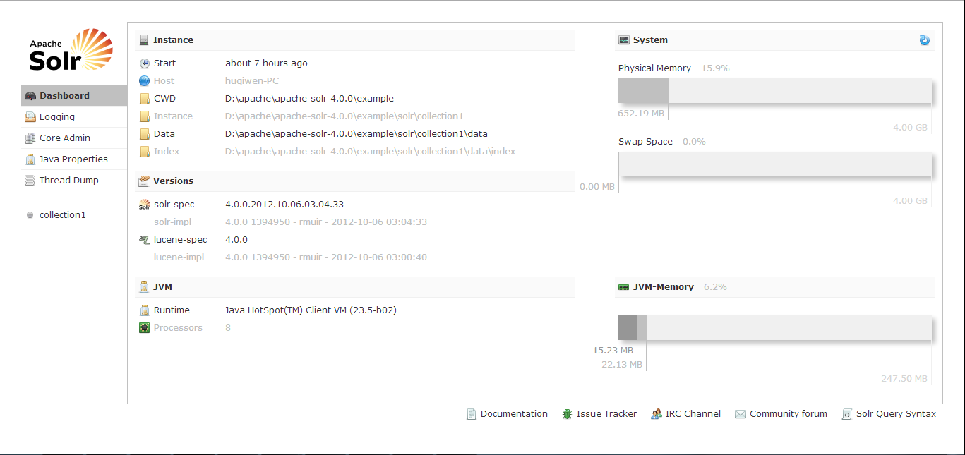 从Solr的官方网站上下载的Solr包里面有一个基于jetty的示例运行环境。下载Solr包,打开里面的example目录,点击里面的start.jar。在浏览器里面输入http://localhost:8983/solr,可以看到如下界面。