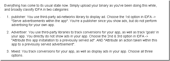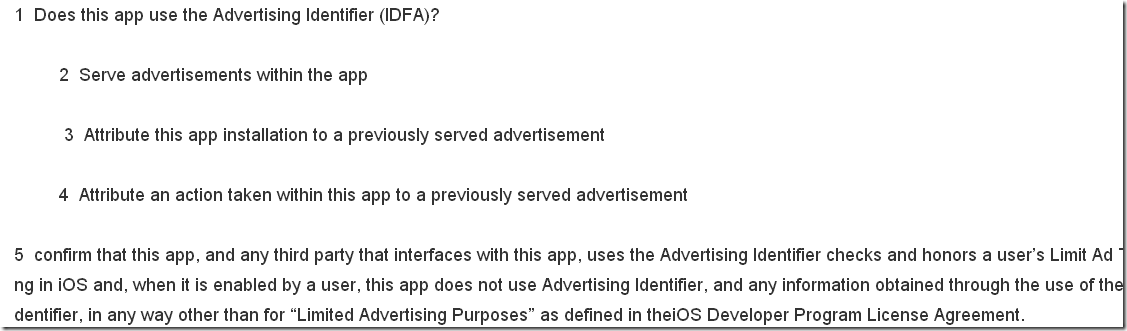 关于这个选项,stackoverflow有人提出了方案(原文链接:http://stackoverflow.com/questions/22979151/improper-advertising-identifier-idfa-usage)