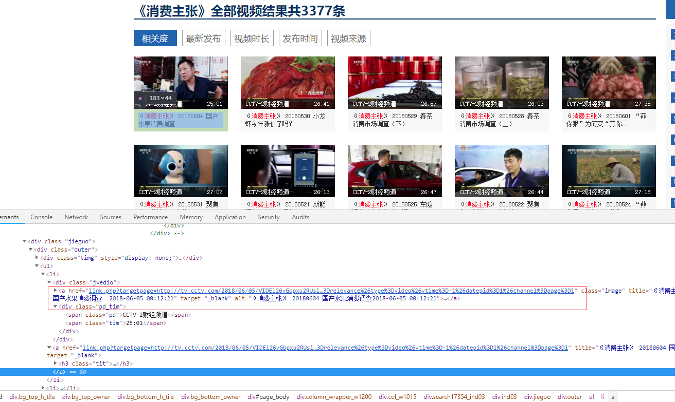 本例子用Selenium +phantomjs爬取央视栏目(http://search.cctv.com/search.php?qtext=消费主张&type=video)的信息(标题,时间)