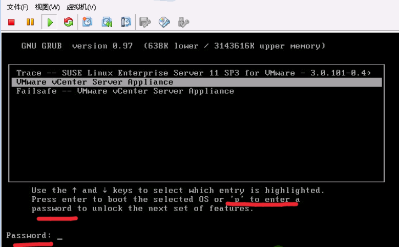 在操作系统启动后,出现 GRUB 引导加载程序后,立即按空格键/p键/e键(我试了这几个键好像都可以)禁用自动引导,让菜单停留在 GNU GRUB 菜单,键入 p, 输入 GRUB 密码。如下图。(一定要开机时候赶紧按,不然就会启动vcenter系统。就行windows进bios一样,别错过机会)