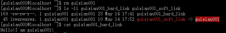 ⒋同时删除原文件guixian001和硬链接文件guixian001_hard_link,这个文件会真正删除。