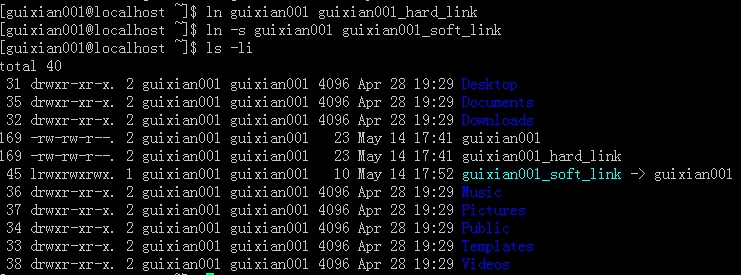 创建guixian001的硬链接文件guixian001_hard_link,和软链接文件guixian001_soft_link。使用ls -li查看。