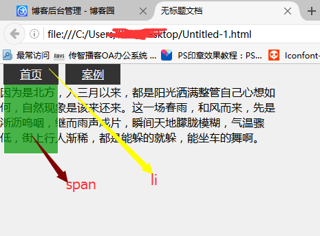 运行:(li是背景深灰色的导航,白色文字是a标签的文字,绿色透明的是类似下拉菜单的span,span是通过父级li相对定位,也就是确定参照物是li之后,自己绝对定位,并且相对父级li的移动距离为top:30px;left:0;)