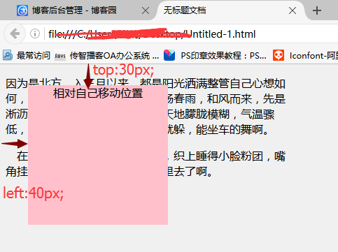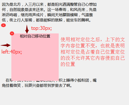 接着把粉色盒子设置一个相对定位,那么注意观察它移动的位置是在原来自己的基础上去移动的,并且是占位置的定位方式: