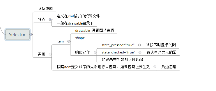 <?xml version="1.0" encoding="utf-8"?> <selector xmlns:android="http://schemas.android.com/apk/res/android"> <item android:drawable="@drawable/abc" android:state_pressed="true"/> <item android:state_checked="false" android:drawable="@drawable/bcd"/> </selector>