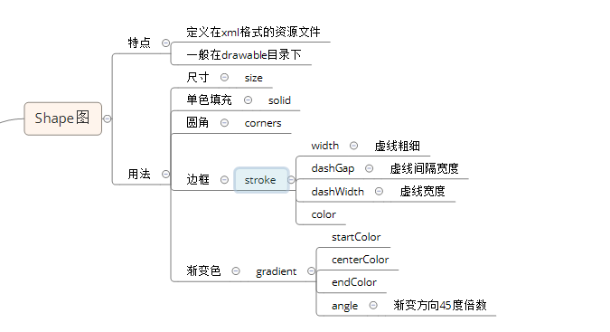 <?xml version="1.0" encoding="utf-8"?> <shape xmlns:android="http://schemas.android.com/apk/res/android"> <!--尺寸--> <size android:height="50dp" android:width="100dp"/> <!--单色填充--> <solid android:color="#f00"/> <!--圆角--> <corners android:radius="50dp"/> <!--边框--> <stroke android:color="#0f0" android:width="5dp" android:dashGap="5dp" android:dashWidth="15dp"/> <!--渐变色--> <gradient android:startColor="#0f0" android:centerColor="#f00" android:endColor="#00f" android:angle="45"/> </shape>