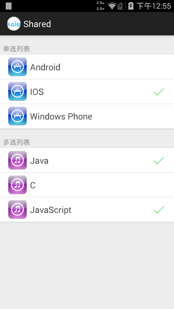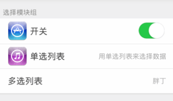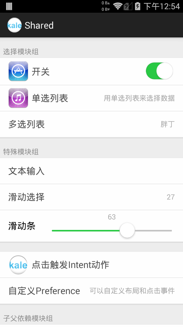 <PreferenceCategory android:layout="@layout/prefs_category_widget" android:title="选择模块组" > <!-- 开关:定义了自定义的widget --> <CheckBoxPreference android:defaultValue="true" android:icon="@drawable/appstore" android:key="checkbox_preference" android:layout="@layout/prefs_list_s_item" android:title="开关" android:widgetLayout="@layout/checkbox_prefs_widget" /> <!-- 单选:弹出一个单选list,选中的值会出现在摘要中 --> <com.kale.preference.MyListPreference android:dialogTitle="dialog_title_list_preference" android:entries="@array/floatColor" android:entryValues="@array/floatColor_value" android:icon="@drawable/itunes" android:key="list_preference" android:layout="@layout/prefs_list_s_item" android:summary="用单选列表来选择数据" android:title="单选列表" /> <!-- 多选:弹出多选列表,选中的项目会出现在摘要中。这里的摘要由代码控制,所以请不要书写 --> <com.kale.preference.MyMultiSelectListPreference android:entries="@array/floatColor" android:entryValues="@array/floatColor_value" android:key="mult_preference" android:layout="@layout/prefs_list_s_item" android:title="多选列表" /> </PreferenceCategory>