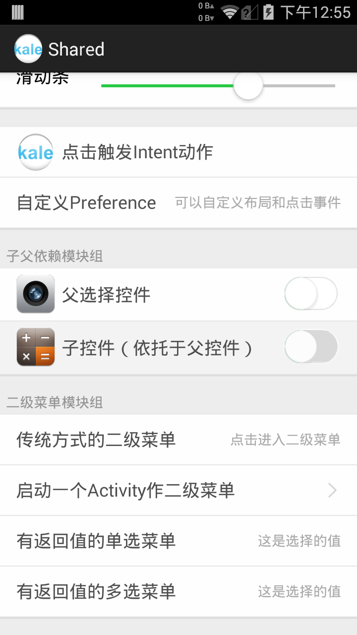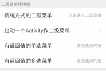 <PreferenceCategory android:layout="@layout/prefs_category_widget" android:title="二级菜单模块组" > <PreferenceScreen android:layout="@layout/prefs_list_s_item" android:summary="点击进入二级菜单" android:title="传统方式的二级菜单" > <PreferenceCategory android:layout="@layout/prefs_category_widget" > <CheckBoxPreference android:defaultValue="true" android:key="cb21" android:layout="@layout/prefs_list_item" android:summaryOff="关闭" android:summaryOn="开启" android:title="功能1" /> <SwitchPreference android:defaultValue="true" android:dialogTitle="点击后触发的功能" android:key="autoScroll" android:layout="@layout/prefs_list_item" android:summaryOff="关闭" android:summaryOn="开启" android:title="自动滚动" /> <ListPreference android:dialogTitle="请选择" android:entries="@array/onTouch" android:entryValues="@array/onTouch_value" android:key="list1" android:layout="@layout/prefs_list_item" android:summary="单选框" android:title="android forum" /> <EditTextPreference android:defaultValue="Hello EditTextPreference" android:dialogTitle="输入设置" android:key="et1" android:layout="@layout/prefs_list_item" android:summary="点击输入" android:title="EditTextPreference Sample" /> </PreferenceCategory> </PreferenceScreen> <PreferenceScreen android:layout="@layout/prefs_list_s_item" android:title="启动一个Activity作二级菜单" android:widgetLayout="@layout/arrow_widget" > <intent android:action="com.kale.intent.action.MY_ACTION" /> </PreferenceScreen> <Preference android:key="getValue_single_prefers" android:layout="@layout/prefs_list_s_item" android:summary="这是选择的值" android:title="有返回值的单选菜单" > </Preference> <Preference android:key="getValue_multi_prefers" android:layout="@layout/prefs_list_s_item" android:summary="这是选择的值" android:title="有返回值的多选菜单" > </Preference> </PreferenceCategory>