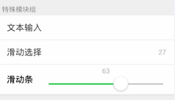 <PreferenceCategory android:layout="@layout/prefs_category_widget" android:title="特殊模块组" > <!-- 输入框模块:输入的文字出现在摘要中 --> <com.kale.preference.MyEditTextPreference android:dialogIcon="@drawable/itunes" android:dialogTitle="请输入要保存的文字" android:key="edittext_preference" android:layout="@layout/prefs_list_s_item" android:negativeButtonText="cancel" android:positiveButtonText="ok" android:summary="点击输入文字" android:title="文本输入" /> <!-- 滑动条模块:点击后出现滑动条对话框 --> <com.kale.preference.MySeekBarDialogPreference android:dialogLayout="@layout/seekbar_dialog_prefs_widget" android:dialogTitle="滑动来选择数值" android:key="seekbar_dialog_preference" android:layout="@layout/prefs_list_s_item" android:negativeButtonText="cancel" android:positiveButtonText="ok" android:summary="点击选择大小" android:title="滑动选择" /> <com.kale.preference.MySeekBarPreference android:key="seekbar_preference" android:layout="@layout/prefs_list_s_item" android:summary="点击选择大小" android:title="滑动条" android:widgetLayout="@layout/arrow_widget" /> </PreferenceCategory>