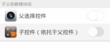 <PreferenceCategory android:layout="@layout/prefs_category_widget" android:title="子父依赖模块组" > <CheckBoxPreference android:icon="@drawable/camera" android:key="parent_checkbox_preference" android:layout="@layout/prefs_list_s_item" android:title="父选择控件" android:widgetLayout="@layout/checkbox_prefs_widget" /> <!-- The visual style of a child is defined by this styled theme attribute. --> <!-- 子控件关联父控件,在父控件选中后子控件才可用 --> <!-- android:layout="?android:attr/preferenceLayoutChild" --> <CheckBoxPreference android:dependency="parent_checkbox_preference" android:icon="@drawable/calculator" android:key="child_checkbox_preference" android:layout="@layout/prefs_list_s_item" android:title="子控件(依托于父控件)" android:widgetLayout="@layout/checkbox_prefs_widget" /> </PreferenceCategory>