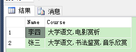 SELECT DISTINCT Name, STUFF((SELECT ',' + Course FROM Student WHERE Name = T.Name FOR XML PATH('')), 1, 1, '') AS Course FROM Student AS T