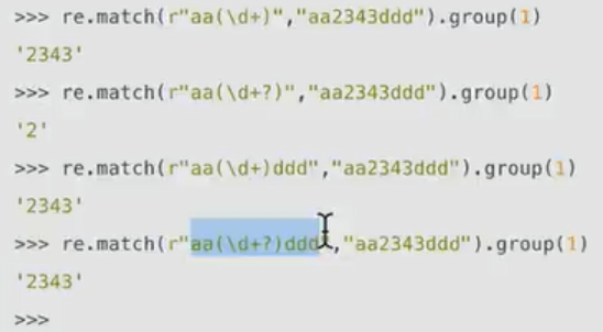 1 s = 'This is a number 234-34-45234-454' 2 #我想匹配s中的数字怎么办?我们理想思路应该如下: 3 r = re.match('.+(\d+-\d+-\d+-\d+)', s) 4 5 #接下来输出括号的元素就可以啦 6 print(r.group(1)) 7 8 9 》》》输出: 10 4-34-45234-454