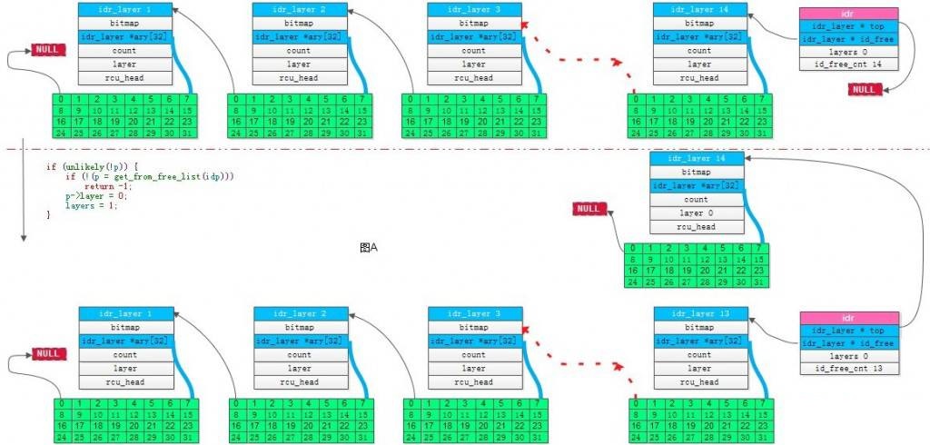 1 static int idr_get_empty_slot(struct idr *idp, int starting_id, 2 struct idr_layer **pa) 3 { 4 struct idr_layer *p, *new; 5 int layers, v, id; 6 unsigned long flags; 7 8 id = starting_id; 9 build_up: 10 p = idp->top; 11 layers = idp->layers; 12 /* 第一次申请ID时,p都为null,看图A */ 13 if (unlikely(!p)) { 14 if (!(p = get_from_free_list(idp))) 15 return -1; 16 p->layer = 0; 17 layers = 1; 18 } 19 /* 20 * 当申请ID比目前分配的空间数还大时,开辟新层 21 * 比如目前是2层结构, 可以分配的空间数为32^2=1024,最大ID为1023, 现在需要申请的ID为1050, 22 * 则需要开辟1层变成3层结构,这样可以分配的空间数为32^3, 最大ID变为32^3 - 1 23 * 看图B 24 */ 25 while ((layers < (MAX_LEVEL - 1)) && (id >= (1 << (layers*IDR_BITS)))) { 26 layers++; 27 if (!p->count) { 28 /* 29 *这里不知道怎么进去的 30 */ 31 p->layer++; 32 continue; 33 } 34 /* 从idp->id_free中取出一个idr_layer结构失败 */ 35 if (!(new = get_from_free_list(idp))) { 36 /* 37 * The allocation failed. If we built part of 38 * the structure tear it down. 39 */ 40 spin_lock_irqsave(&idp->lock, flags); 41 for (new = p; p && p != idp->top; new = p) { 42 p = p->ary[0]; 43 new->ary[0] = NULL; 44 new->bitmap = new->count = 0; 45 __move_to_free_list(idp, new); 46 } 47 spin_unlock_irqrestore(&idp->lock, flags); 48 return -1; 49 } 50 new->ary[0] = p; 51 new->count = 1; 52 new->layer = layers-1; 53 if (p->bitmap == IDR_FULL) 54 __set_bit(0, &new->bitmap); 55 p = new; 56 } 57 /* idp->top = p */ 58 rcu_assign_pointer(idp->top, p); 59 idp->layers = layers; 60 /* 以上部分主要处理layer相关,以下部分主要处理id相关 */ 61 v = sub_alloc(idp, &id, pa); 62 if (v == IDR_NEED_TO_GROW) 63 goto build_up; 64 return(v); 65 }