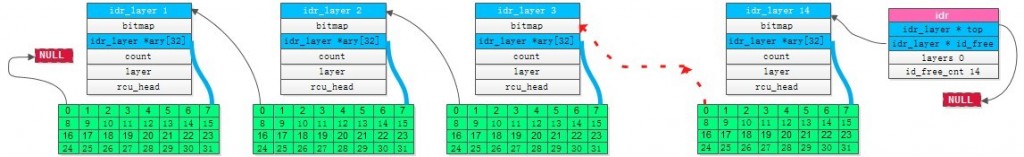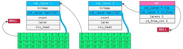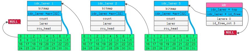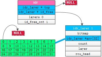 struct idr { struct idr_layer __rcu *top; /*根节点*/ struct idr_layer *id_free; /*空闲节点*/ int layers; /*树的高度*/ int id_free_cnt; /*空闲节点数*/ spinlock_t lock; }; struct idr_layer { unsigned long bitmap; /*位图*/ struct idr_layer __rcu *ary[1<<IDR_BITS]; /*孩子节点或者地址数据*/ int count; /*ary已存放数*/ int layer; /* 相对叶子节点的高度 */ struct rcu_head rcu_head; };