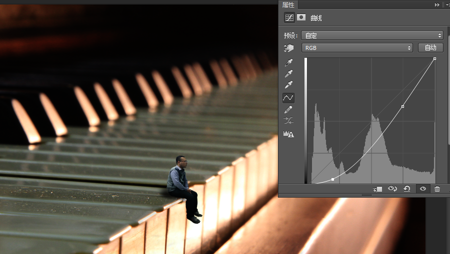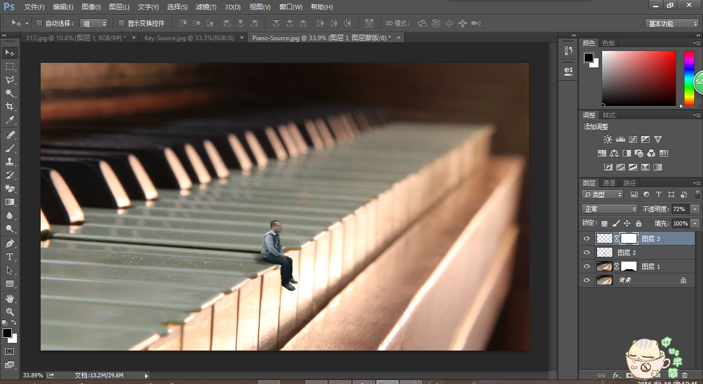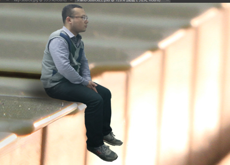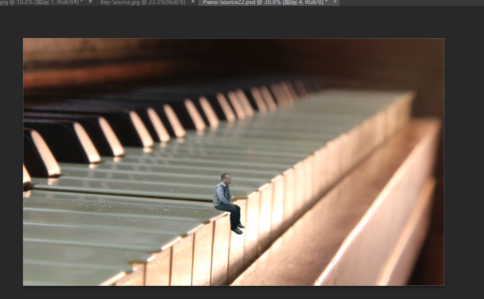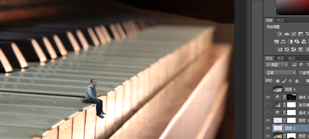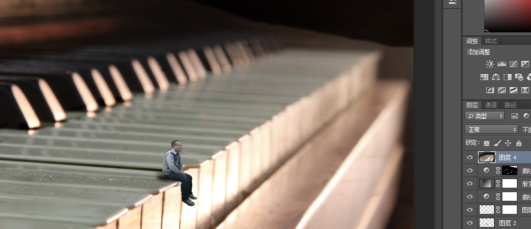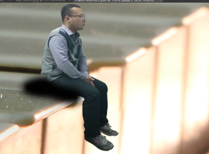 画笔把应该给琴键遮挡的部位擦去,现在人物是坐在琴键上的。