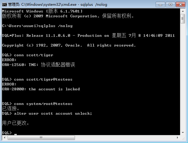 新建了一个数据库testeos,但是在用scott用户登录时出现错误:ORA-28000: the account is locked。这是因为scott用户被锁定了,我们要做的就是将scott用户解锁。