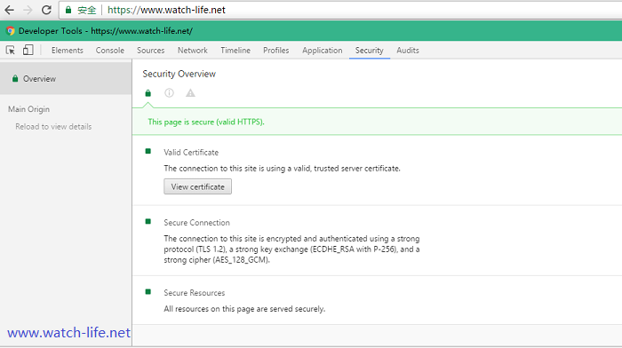 从chrome 56 版本开始,查看网站的SSL证书的方式做了调整,原来的版本可以点击绿色的小锁进入查看页面,新版本的进入方式:按F12 ,打开开发者工具窗口,进入Security选项卡,然后点击View certificate,如下图所示:
