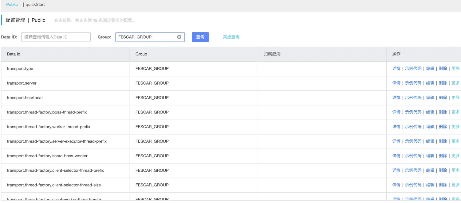 脚本执行最后输出 "init nacos config finished, please start fescar-server." 说明推送配置成功。若想进一步确认可登陆Nacos 控制台 配置列表 筛选 Group=FESCAR_GROUP 的配置项。