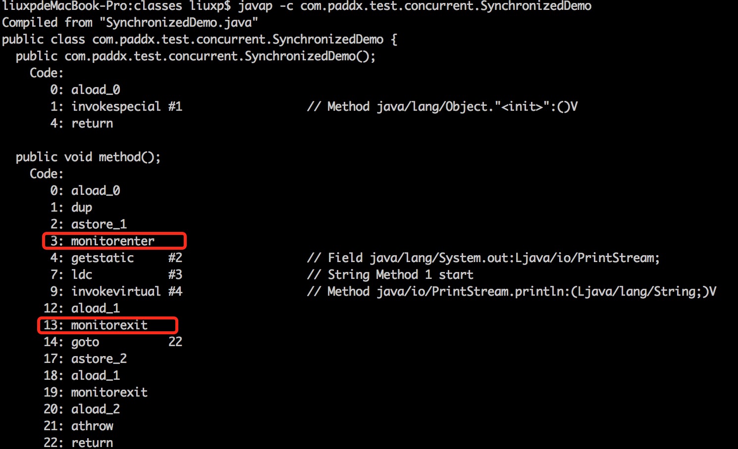 从反编译的结果来看,方法的同步并没有通过指令monitorenter和monitorexit来完成(理论上其实也可以通过这两条指令来实现),不过相对于普通方法,其常量池中多了ACC_SYNCHRONIZED标示符。JVM就是根据该标示符来实现方法的同步的:当方法调用时,调用指令将会检查方法的 ACC_SYNCHRONIZED 访问标志是否被设置,如果设置了,执行线程将先获取monitor,获取成功之后才能执行方法体,方法执行完后再释放monitor。在方法执行期间,其他任何线程都无法再获得同一个monitor对象。 其实本质上没有区别,只是方法的同步是一种隐式的方式来实现,无需通过字节码来完成。