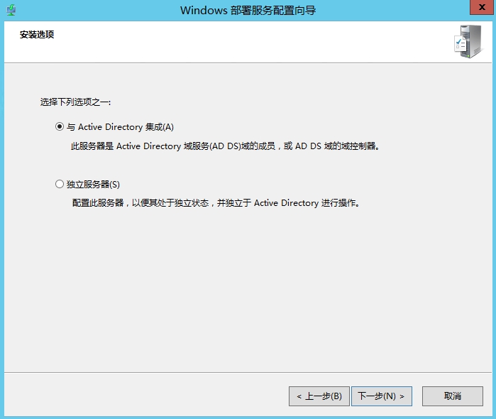 从 Windows Server 2012 开始,Windows 部署服务可以在独立服务器模式下安装。该操作会消除对 Active Directory 的依赖。你仍需要使用 DHCP、DNS 和充足权限才能安装和配置 Windows 部署服务。这种情况下,使用本地存储可保留预安排设备的相关信息。