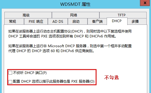 如果WDS服务器与DHCP在同一操作系统上,我们就需要在配置WDS时,将下图两个端口勾选,此时WDS会自动在DHCP作用域中添加#60选项值;