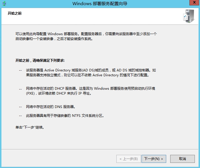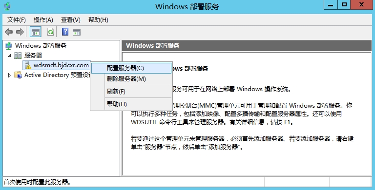 上文我们成功安装了Windows部署服务角色,接下来我们需要对WDS进行简单的配置以满足后边环境的使用需求。
