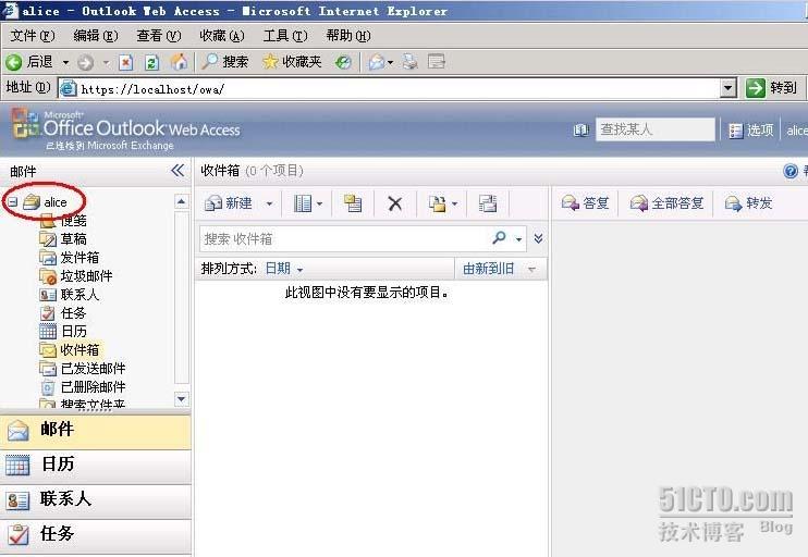 让alice用户登录OWA,发现先前被删除的邮件又自动回来了,如图23,证明恢复操作完全成功。