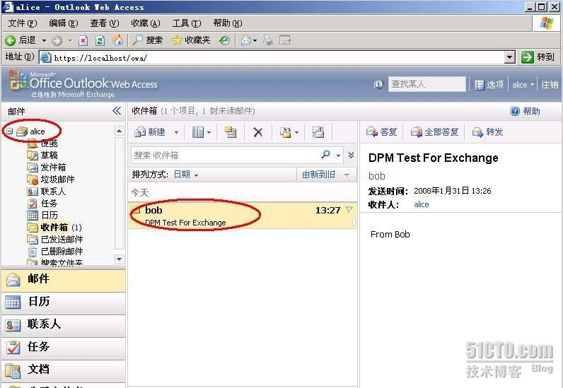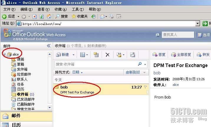 2. 用户alice登录OWA后,可以看到bob发来的一封信,主题为“DPM Test For Exchange”,如图1.