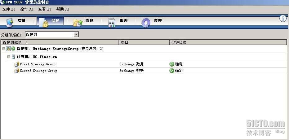 12. 返回到“DPM 2007 管理员控制台”,在“保护”一栏中可以看到已经多出一个我们刚才创建的保护组,如图13所示: