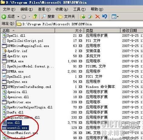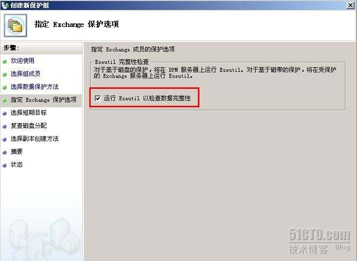 (注:受保护的服务器上必须安装 Exchange Server 数据库实用程序 (Eseutil.exe和Ese.dll),才能实现基于磁带和磁盘的保护。也就是基于磁盘保护时,需要拷贝Exchange Server 2007服务器中的Eseutil.exe和Ese.dll两个文件到DPM服务器的安装目录中,默认目录为:C:\Program Files\Microsoft DPM\DPM\bin ,如图7所示。否则此处的“Eseutil 完整性检查”是不能够正确完成的,此外,这两个文件的架构类型要正确,也就是说如果你的DPM是32位,就不要把64位的Exchange中的这两个文件拷贝进去。切记!详情请查看帮助文档)