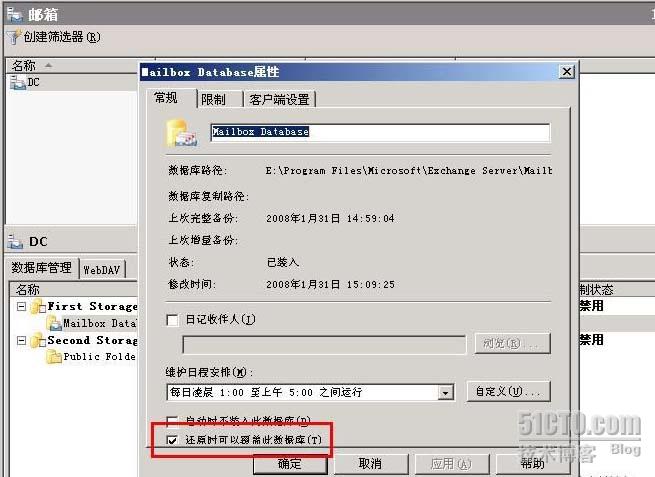 3. 先回到Exchange管理控制台,将数据库“Mailbox Database”设置为“还原时可以覆盖此数据库”。如图15.否则恢复将失败。(注:用DPM恢复exchange2003好像不需要此步,但是在2007中好像不行。希望DPM2007的后续版本能帮我们省略这个步骤。)