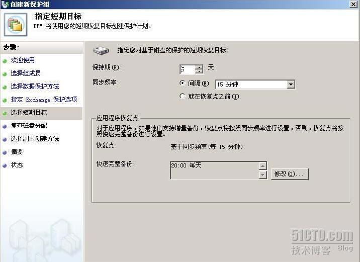 7. 在“指定短期目标”窗口中根据需要进行相应的设置,我这里保持默认值。在实际生产环境下,同步频率可以稍微设置宽点,默认15分钟还是太短了点,。设置完后单击“下一步”,如图8所示。