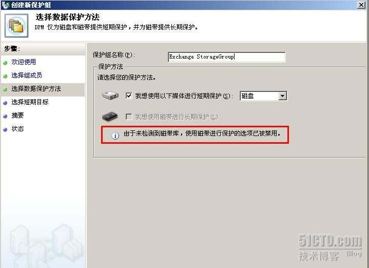 5. 在“选择数据保护方法”窗口中输入保护组名称,然后选择一种保护方法,由于我的演示环境中没有带库,所以“我想使用磁带进行长期保护”一栏是灰色,导致只能够选择“磁盘”保护,选择完成后单击“下一步”,如图5所示: