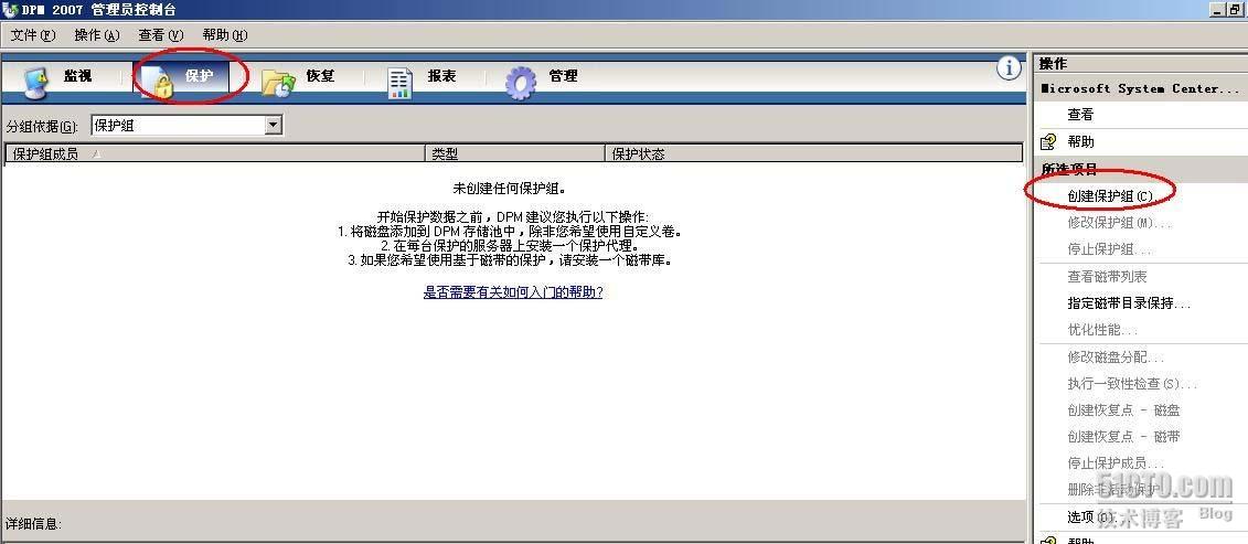 2. 打开“DPM 2007 管理员控制台”,定位到“保护”,在右边的操作窗口中单击“创建保护组”,如图2所示: