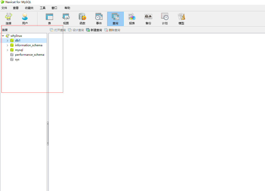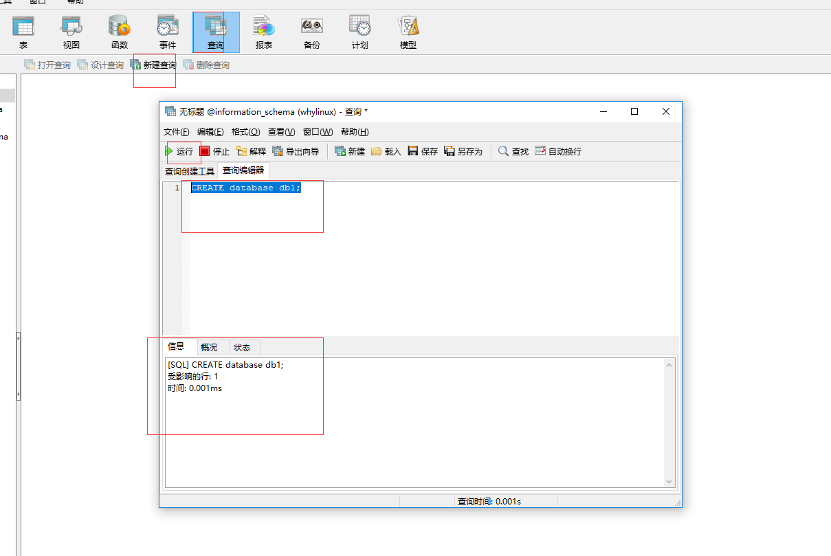 点击Navicat中的查询,然后新建查询,然后输入下面语句,然后点击运行,之后再刷新一下,就可以看见创建出来了一个库db1。