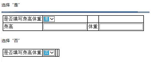 <html> <head> <meta http-equiv="Content-Type" content="text/html; charset=gb2312" /> <title>无标题文档</title> <style type="text/css"> .div1{ width:300px; height:80px; border:1px solid green;} .div2{ width:300px; height:80px; border:1px solid red;} </style> <SCRIPT language=javascript type=text/javascript src="jquery-1.7.2.min.js"></SCRIPT> <script type="text/javascript"> function setDetailMsgRow(rowID,sel) { var row = document.getElementById(rowID); if (row != null) { if (sel.value == 1) { row.style.display = "block"; } else { row.style.display = "none"; } } } /*自动加载隐藏框,ready方法必须要引用jquery的库*/ $(document).ready(function(){ var sel = document.getElementById('selID'); setDetailMsgRow('show',sel); }); function onload() {var sel = document.getElementById('selID'); setDetailMsgRow('show',sel); } </script> </head> <body> <TABLE border="1" cellpadding="2" cellspacing="0"> <TBODY> <TR> <TD>是否填写身高体重</TD> <TD><SELECT width='100%' id=selID onchange = "setDetailMsgRow('show',this)"> <OPTION value="1" selected>是</OPTION> <OPTION value="0">否</OPTION> <OPTION ></OPTION> </SELECT> </TD><TD></TD><TD></TD></TR> <TR id=show style="display:none;"> <TD>身高</TD> <TD><INPUT id=Height></TD> <TD>体重</TD> <TD><INPUT id=Weight></TD></TR> </TBODY> </TABLE> </body> </html>