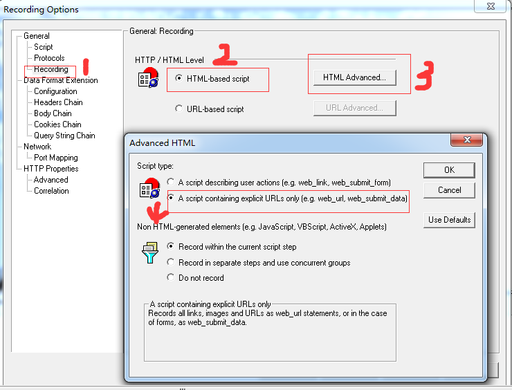 而web_ur 和 web_submit_data使用的是绝对路径地址,本身可以独立运行,不依赖上下文。增加了代码的灵活性和稳定性,所以我们一般建议使用后者,可是在系统录制脚本的过程中默认的使用的是web_link 和web_submit_form,那么怎么样才能使工具在录制代码的过程中使用web_ur 和 web_submit_data呢?