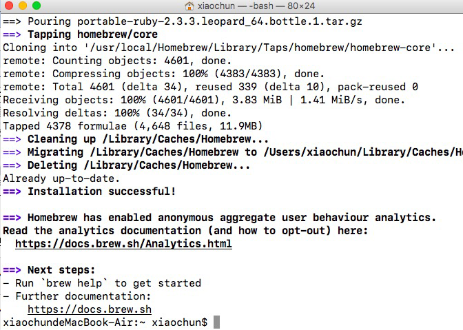 ruby -e "$(curl -fsSL https://raw.githubusercontent.com/Homebrew/install/master/install)"
