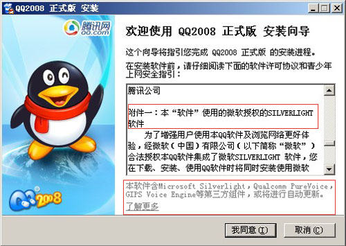 为了增强用户使用本QQ软件及浏览网络更好体验,经微软<中国>有限公司(以下简称“微软”)合法授权本QQ软件集成了微软Silverlight 软件,您在下载、安装、使用QQ软件时将同时安装使用微软Silverlight软件。该软件是微软出品的一个浏览器的增强模块,使用该软件令浏览器可以在HTML中渲染丰富的内容。如果用户不需要微软Silverlight软件的功能,用户可以从系统“控制面板”的“添加/删除程序”中卸载该软件。