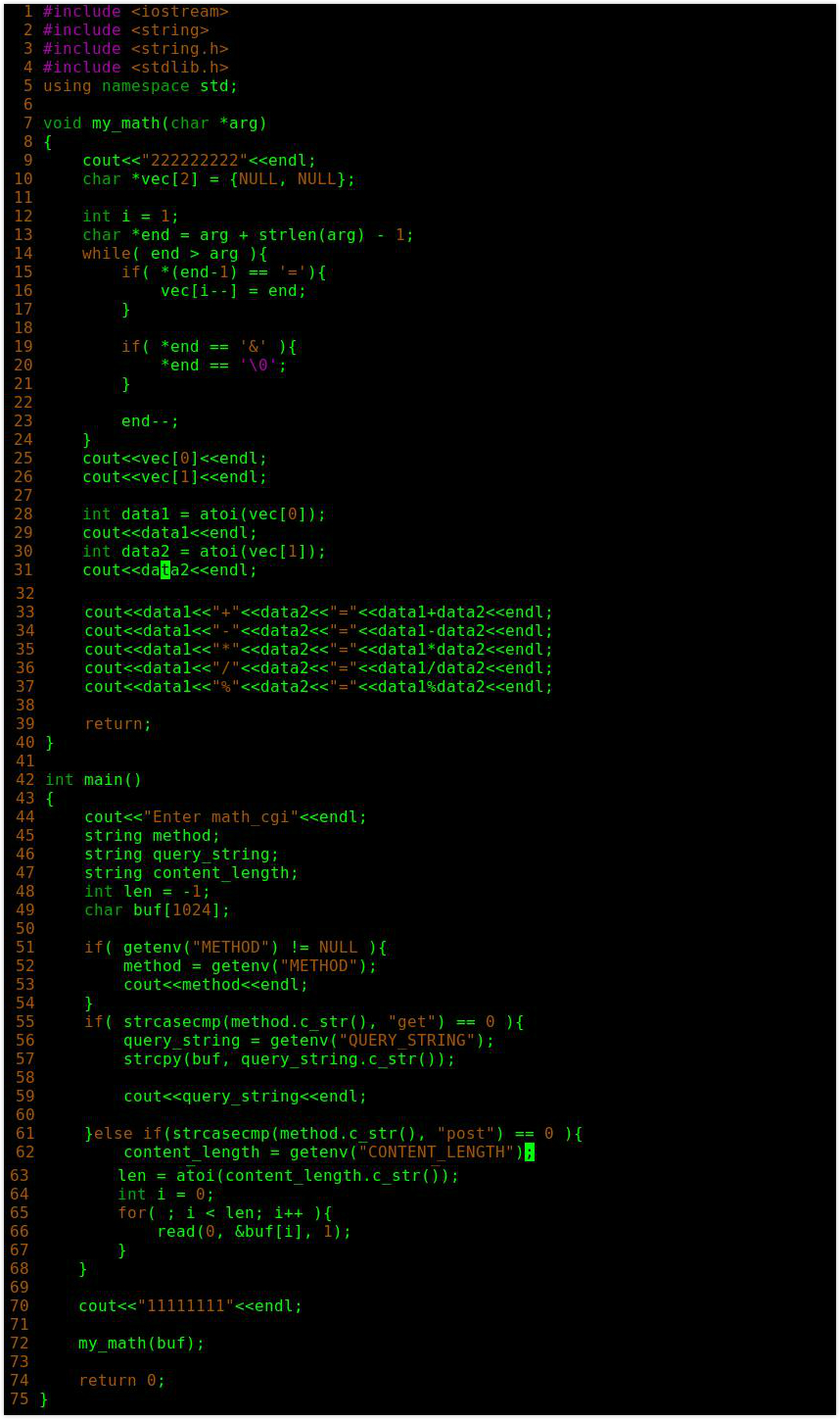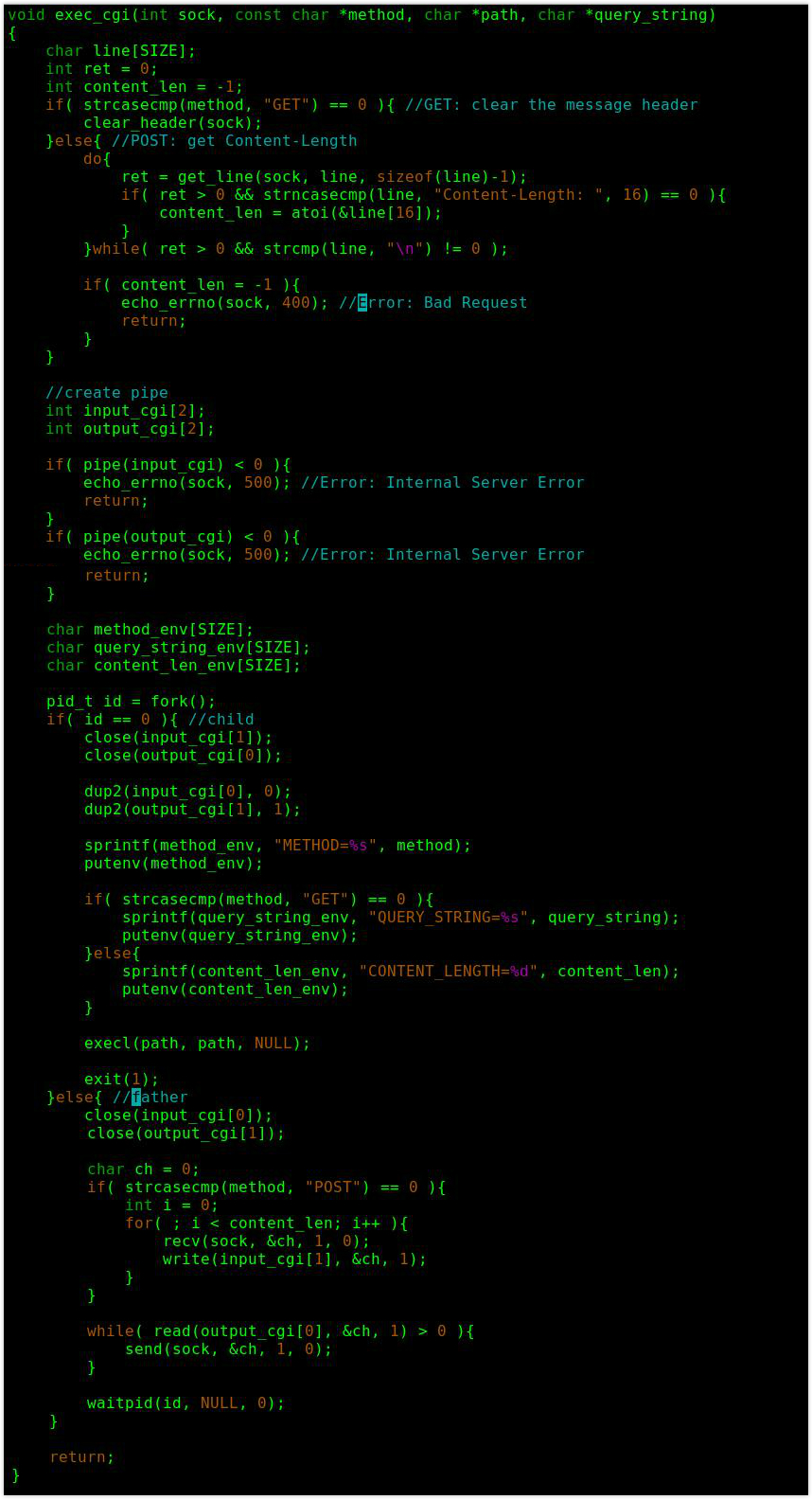 如果请求的资源是cgi程序,exec_cgi()函数运行cgi程序,并将运行结果发送给请求方。