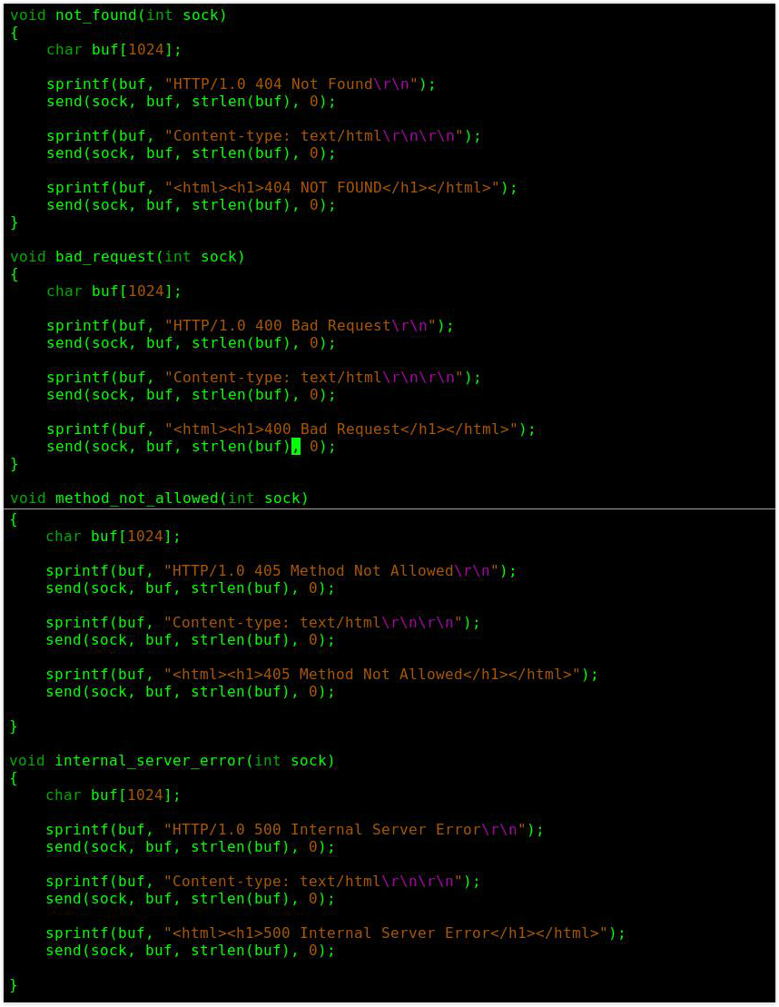 处理的错误码有400(Bad Request)、404(Not Found)、405(Method Not Allowed)、500(Internal Server Error)。