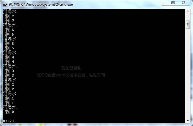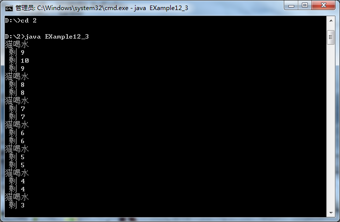 1 /* 2 * 关于线程下共享相同的内存单元(包括代码与数据) 3 * ,并利用这些共享单元来实现数据交换,实时通信与必要的同步操作。 4 * 对于Thread(Runnable target)构造方法创建的线程,轮到它来享用CPU资源时。 5 * 目标对象就会自动调用接口中的run()方法 6 * */ 7 8 /* ----------------举例子------------------- */ 9 10 /* 11 * 使用Thread类创建两个模拟猫和狗的线程,猫和狗共享房屋中的一桶水,即房屋是线程的目标对象 12 * ,房屋中的一桶水被猫和狗共享。猫和狗轮流喝水(狗大喝水多,猫小喝水少),当谁被喝尽时,猫和狗进入 13 * 死亡状态,猫和狗进入死亡状态。猫和狗在轮流喝水的过程中,主动休息片刻(让THread类调用Sleep(int n)) 14 * 进入中断状态),而不是等到被强制中断喝水。 15 **/ 16 package DEMO; 17 18 public class EXample12_3 { 19 20 public static void main( String args [] ) 21 { 22 House house = new House(); 23 house.setWater(10); 24 Thread dog,cat ; 25 dog = new Thread(house); //dog和cat的目标对象相同 26 cat = new Thread(house); 27 dog.setName("狗"); 28 dog.setName("猫"); 29 dog.start(); 30 cat.start(); 31 } 32 } 33 34 class House implements Runnable 35 { 36 int WaterAmount ; 37 38 public void setWater(int w) 39 { 40 WaterAmount = w; 41 } 42 public void run() { 43 // TODO Auto-generated method stub 44 while(true) 45 { 46 String name =Thread.currentThread().getName(); 47 if(name.equals("狗")) 48 { 49 System.out.println(name+"喝水"); 50 WaterAmount =WaterAmount-2; 51 } 52 else 53 if(name.equals("猫")) 54 { 55 System.out.println(name+"喝水"); 56 WaterAmount=WaterAmount-1; 57 } 58 59 System.out.println(" 剩 "+WaterAmount); 60 try { 61 Thread.sleep(2000); //间隔时间 62 } catch (InterruptedException e) { 63 // TODO Auto-generated catch block 64 e.printStackTrace(); 65 } 66 if(WaterAmount<=0) return ; 67 } 68 } 69 }